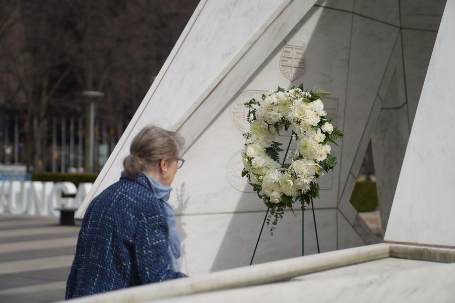 A woman visits the Art of Return memorial at the UN headquarters in New York, March 25, 2026. The UN General Assembly (UNGA) on Wednesday adopted a draft resolution of "Declaration of the Trafficking of Enslaved Africans and Racialized Chattel Enslavement of Africans as the Gravest Crime against Humanity." The draft resolution was adopted by a vote of 123 in favor, 52 abstaining and three against. Argentina, Israel and the United States voted against it. March 25 marks the International Day of Remembrance of the Victims of Slavery and the Transatlantic Slave Trade. (Xinhua/Zhang Fengguo)■