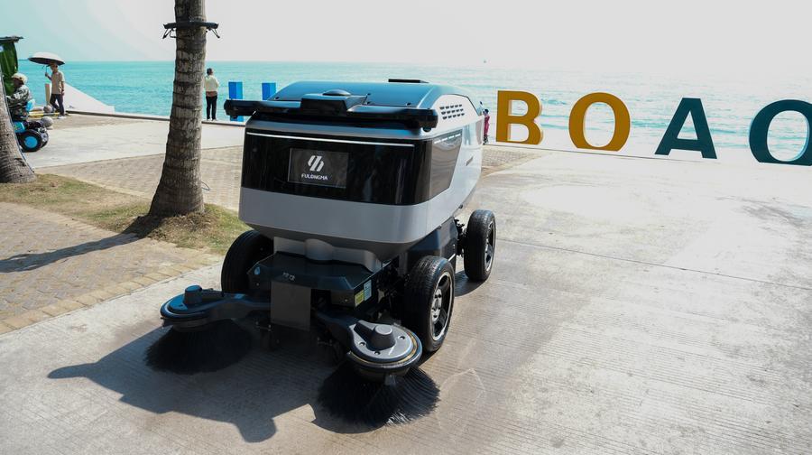 An intelligent cleaning robot works in Boao Town, Qionghai City, south China's Hainan Province, March 25, 2026. Smart sanitation facilities are in service during the Boao Forum for Asia (BFA) Annual Conference 2026, becoming a highlight of urban services with accurate dispatch, rapid disposal and high standards. (Xinhua/Liu Lianfen)