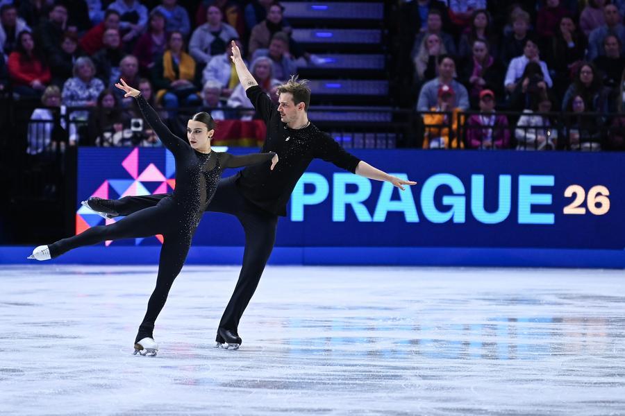 Daria Danilova (L)/Michel Tsiba of the Netherlands compete during the pairs's short program of the ISU Figure Skating World Championships 2026 in Prague, the Czech Republic, March 25, 2026. (Xinhua/Zhang Haofu)