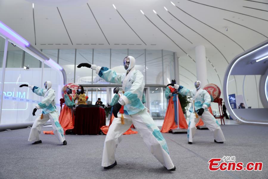 Robots dance in an exhibition hall for the upcoming 2026 Zhongguancun Forum in Beijing, March 24, 2026. (Photo/China News Service)
