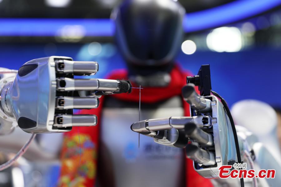 A robot performs threading in an exhibition hall for the upcoming 2026 Zhongguancun Forum in Beijing, March 24, 2026. (Photo/China News Service)